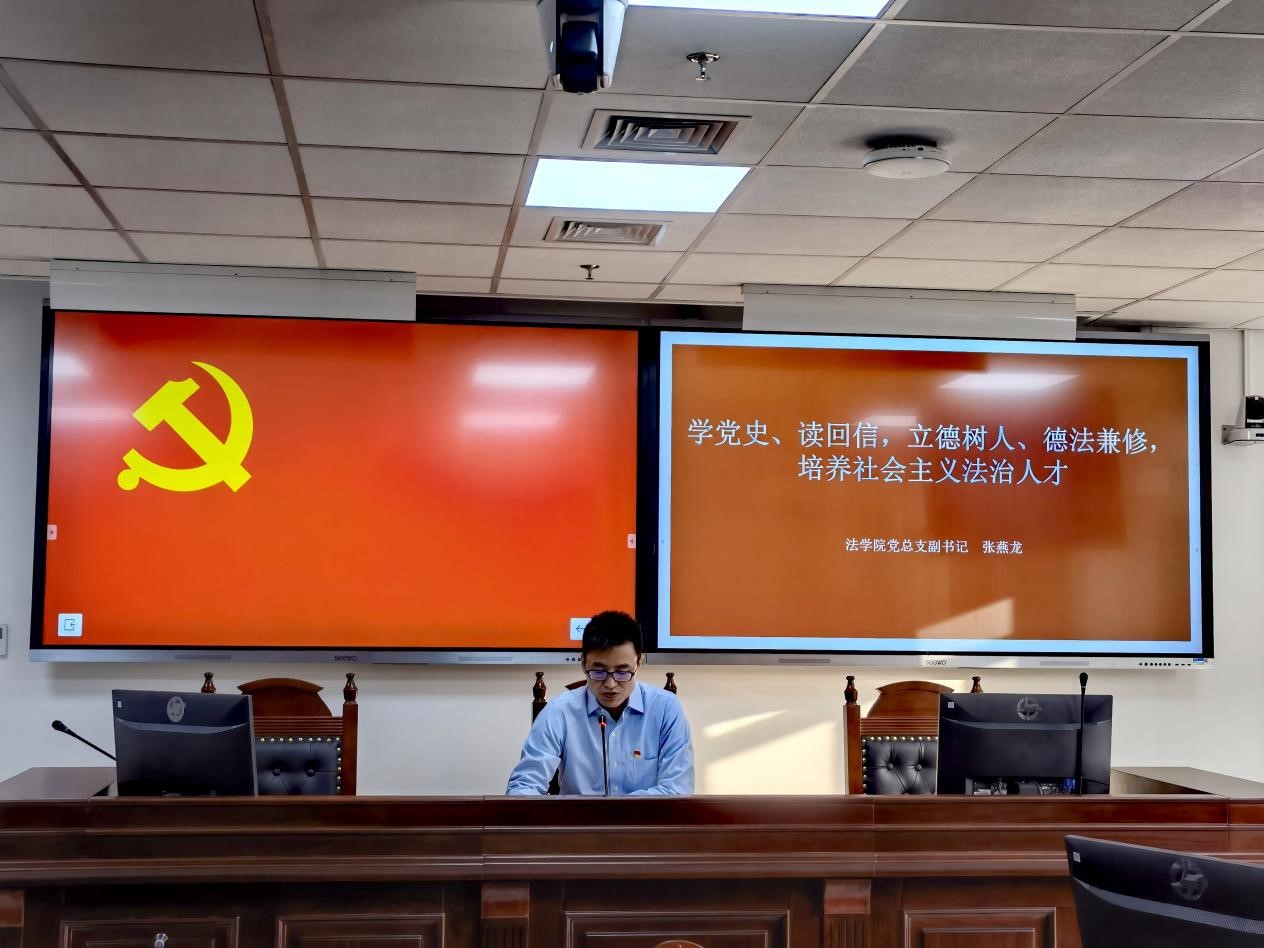 张燕龙最后总结到,作为一名共产党人、一名北外人、一名北外法学人,应学好党史、不忘初心、牢记使命,学习回信精神、传承红色基因,立德树人、德法兼修,培养更多有家国情怀、全球视野、专业本领的复合型人才,为社会主义法治事业做出自己的贡献。