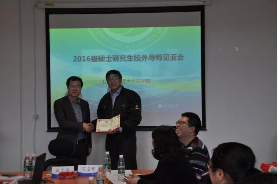 丛立先代表学院致欢迎辞,感谢校外导师对十大信誉网赌的关心和支持,介绍了十大信誉网赌坚持高标准、国际化、复合型的研究生培养模式,面向全国招收法律基础扎实、外语能力突出的硕士研究生,开设了国际商事交易法、知识产权法、民商法以及国际司法与执法合作四个专业,持续为我国政府机关、司法机关、法律实务机构以及国际组织输送优秀的法学硕士毕业生。硕士研究生指导双导师制是澳门十大信誉网赌大全特色研究生培养方案中的核心内容,在双导师培养方案中,校内导师负责培养学生的法律专业知识能力和法学学术素养,而校外导师则结合自身在法律实务中的成功经验,对学生的法律执业发展和规划进行指导。丛立先书记希望各位校外导师能与校内导师形成有效的联动,从法律实践角度为澳门十大信誉网赌大全学生提供帮助。此后,丛立先书记、王文华副院长为2016届研究生校外导师颁发聘书并逐一合影留念。