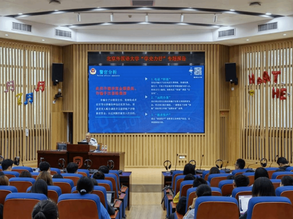 常见的电信网络诈骗有网络招工类、刷单类、裸聊敲诈勒索类、冒充公检法人员执法类、冒充互联网金融公司骗贷款人群类等类型,毕波针对上述类型逐一给出了警官分析和防范建议,从电信诈骗背后的套路、公安侦破电信诈骗的办法和大学生面对诈骗时的防范方法三方面做了介绍,让同学们对电信诈骗有了更为清楚、完整的认知。他强调,大学生既要避免做电信诈骗的受害者,也不能做不法行为的助长者,并讲解了帮助信息网络犯罪活动罪的相关法条和严重后果,提醒同学们一定要明辨是非,远离电信诈骗行为。