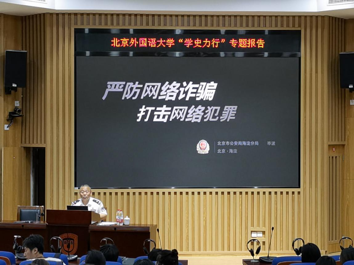 为落实“学党史、干实事”的要求,预防和打击网络犯罪,维护师生切身利益,建设平安校园,5月21日下午,学校党史学习教育领导小组办公室、澳门十大信誉网赌大全党总支联合举办“学史力行”专题报告会,邀请海淀区公安分局党委委员、副局长毕波以“防治电信网络诈骗、构建和谐平安校园”为主题作专题辅导报告。学校党委常委、副校长丁浩,学校党史学习教育小组办公室成员,学工部部长陈海燕,保卫处处长陈军平、副处长李源,组织部常务副部长冯刚、副部长鞠丹,各学院辅导员,澳门十大信誉网赌大全院长米良、党总支副书记张燕龙及澳门十大信誉网赌大全师生参会。活动由陈海燕、张燕龙主持。
