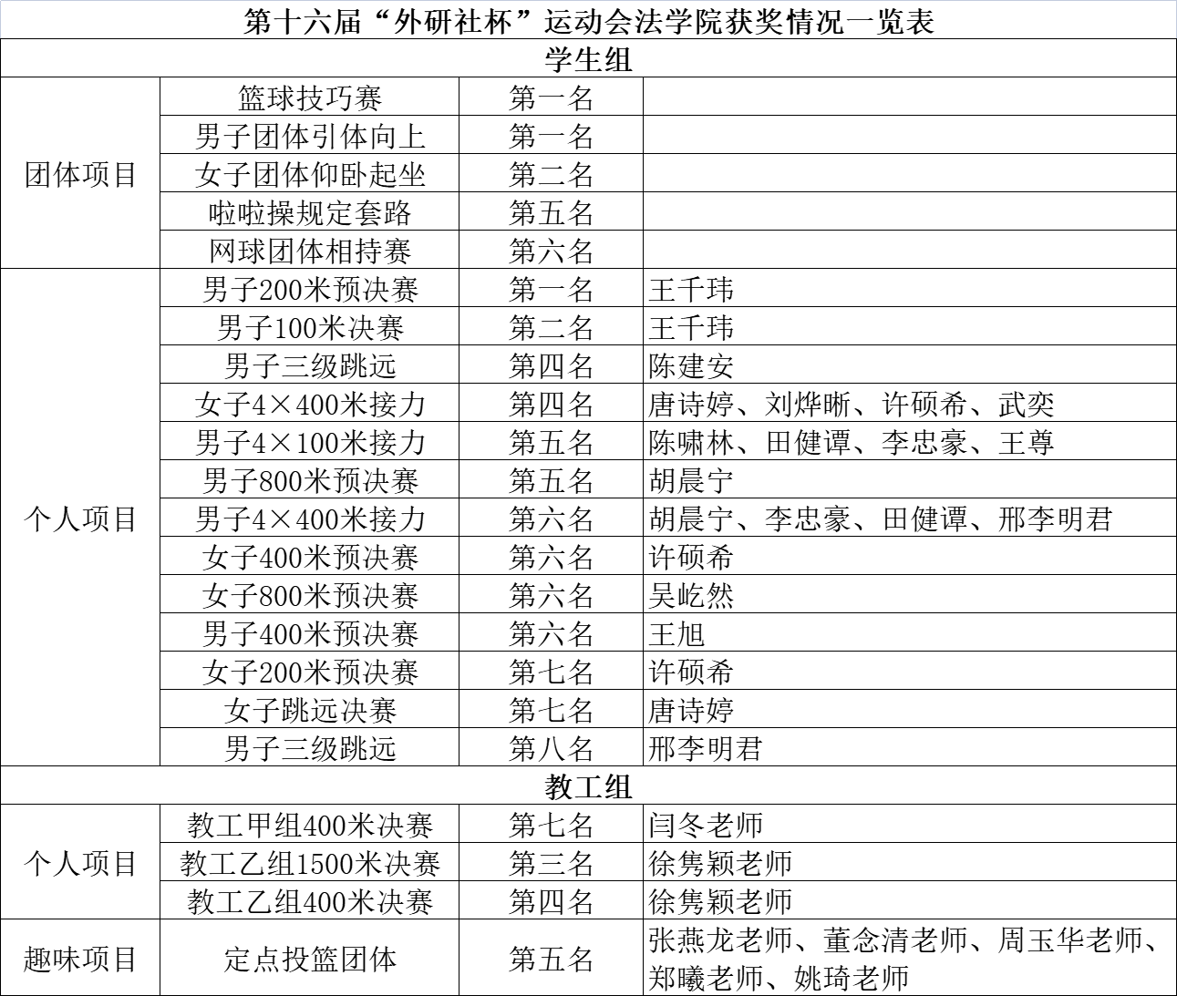 经过一日激烈角逐,澳门十大信誉网赌大全最终取得团体总分第四名的优异成绩。本届运动会举办过程中,澳门十大信誉网赌大全领导高度重视、教职工全体参与,澳门十大信誉网赌大全学子积极报名、运动健儿们奋勇争先、拼搏进取,在体育锻炼中享受乐趣、增强体质、健全人格、锤炼意志,促进德智体美劳全面发展,尽情彰显法学人风采。期待澳门十大信誉网赌大全师生继续保持运动热情,在运动场上再创佳绩!