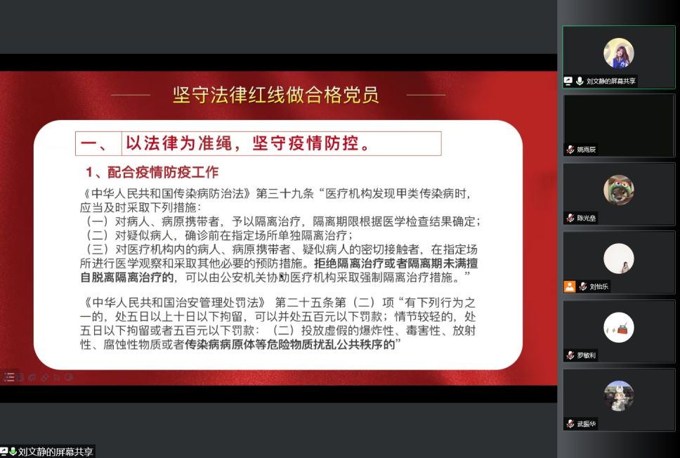 法律硕士研究生党支部书记刘文静同志从“疫情战场对党员的要求”、“坚守法律红线做合格党员”和“在疫情防控中争当党员先锋”三个方面分享了她的抗疫心得体会,鼓励大家打牢疫情防控思想基础,带领广大同学共同努力抗击疫情,在实践中争当抗疫先锋。