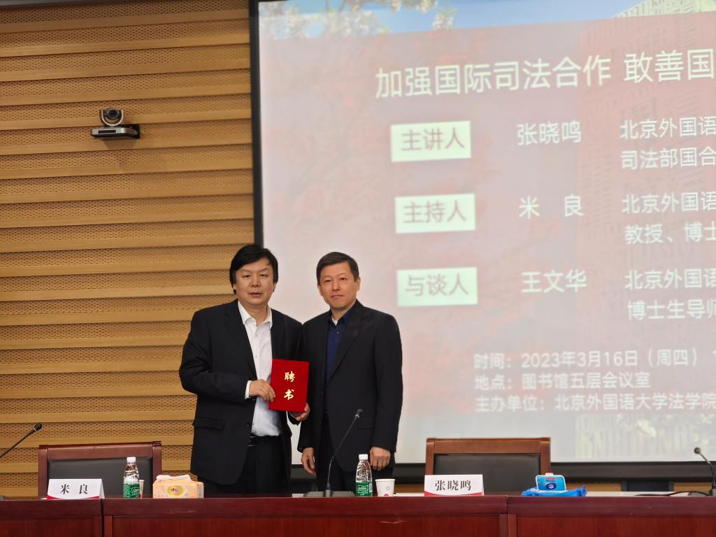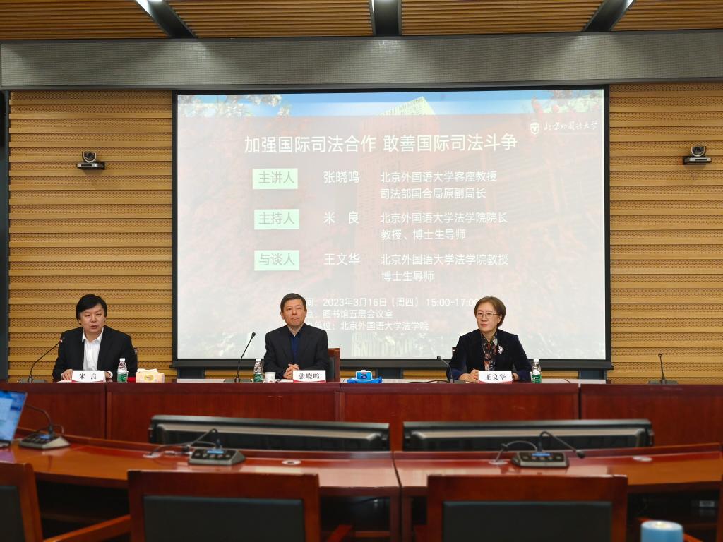 3月16日下午,“法学名师进北外——加强国际司法合作,敢善国家司法斗争”讲座在澳门信誉最好十大平台图书馆五层会议室进行。讲座邀请到澳门信誉最好十大平台客座教授、司法部国际合作局原副局长、司法部公职律师、中国国际法学会常务理事张晓鸣教授担任主讲人,院长米良教授主持讲座,澳门十大信誉网赌大全王文华教授担任与谈人。