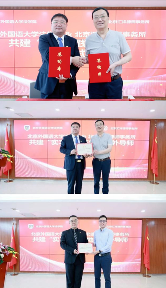 2023年5月22日15:00,澳门十大信誉网赌大全与北京汇祥律师事务所与共建“实习实践基地”签约暨揭牌仪式在北京汇祥律所成功举行。北外澳门十大信誉网赌大全党总支书记王卫放,副书记张燕龙,澳门十大信誉网赌大全教师、硕士生导师徐隽颖,汇祥律所创始合伙人、主任、管委会主任李超峰博士,创始合伙人、党总支书记焦景收,执行主任栗彬,青年律师工作委员会主任、数字经济与合规管理法律专业委员会主任乔木,劳动与社会保障法律专业委员会主任张益先及多位汇祥律师、北外澳门十大信誉网赌大全学生出席揭牌仪式。揭牌仪式由汇祥律所青年工作委员会主任乔木律师主持。