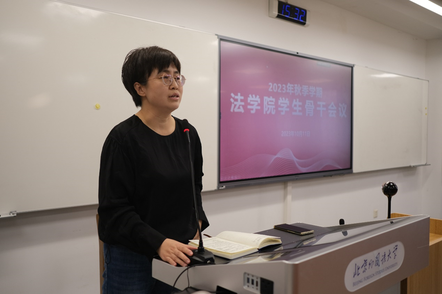 郭向华副书记向同学们介绍了新学期学院学生工作计划,学院将从建立学院校友导师计划、加强学生党支部建设、拓展实习实践基地、依托大学生德育工作室开展普法实践活动等方面着手,拓宽学生交流成长平台。她对学生骨干的工作给予充分肯定,对大家的辛勤工作表示感谢,并对大家提出了希望和要求。她指出,学生干部作为学生群体的优秀代表、学生活动的组织者和领导者,应该在学院党总支领导下开展工作,引领学生组织实现自我管理、自我教育和自我服务。她强调,学生干部不仅要在学习方面为同学们作出表率,更要以道德为先;要有服务意识和敬业精神,当好学校和同学们之间的桥梁和纽带;应主动学习工作方法,提升工作能力,发挥聪明才智。郭老师最后引用习近平总书记的讲话作为结语,鼓励同学们在以后的学习以及学生工作中赓续奋斗,寄语同学们成长为“具有坚定理想信念、强烈家国情怀、扎实法学根底的法治人才”。