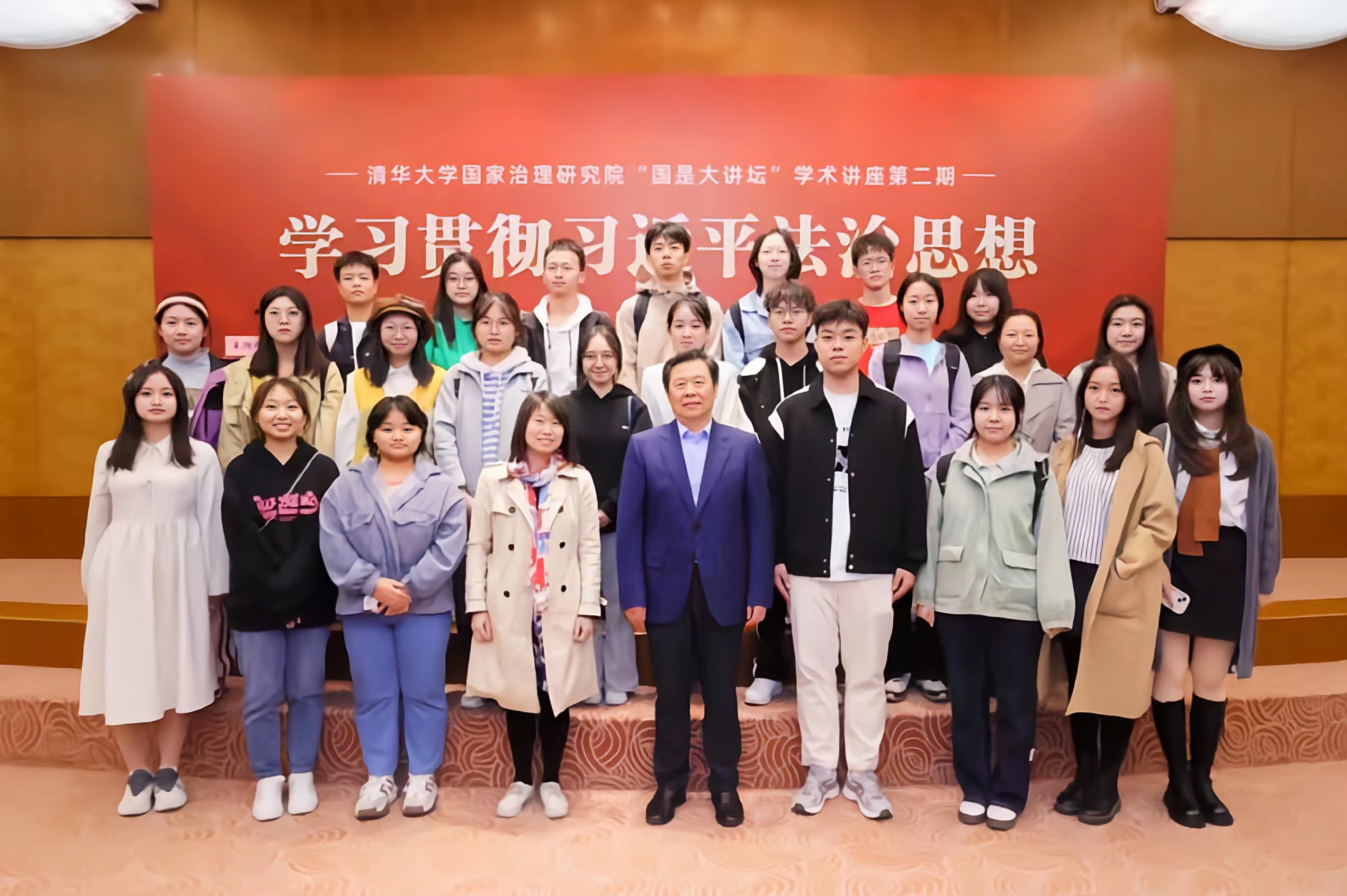 2023年10月21日星期六下午,澳门十大信誉网赌大全康玉梅老师带领澳门十大信誉网赌大全2023级本科新生3班全体同学和数名研究生同学前往清华大学,深入学习贯彻习近平法治思想,进一步引导学生学习习近平法治思想,坚定理想信念,聆听清华大学国家治理研究院“国是大讲坛”学术讲座第二期“学习贯彻习近平法治思想”。该讲座在清华大学中央主楼接待厅正式举行,十三届全国人大常委、全国人大监察和司法委员会副主任委员、中国法学会副会长、中国法理学研究会名誉会长徐显明教授担任主讲人,清华大学国家治理研究院院长、清华大学党委原常务副书记姜胜耀主持。