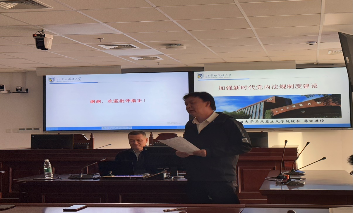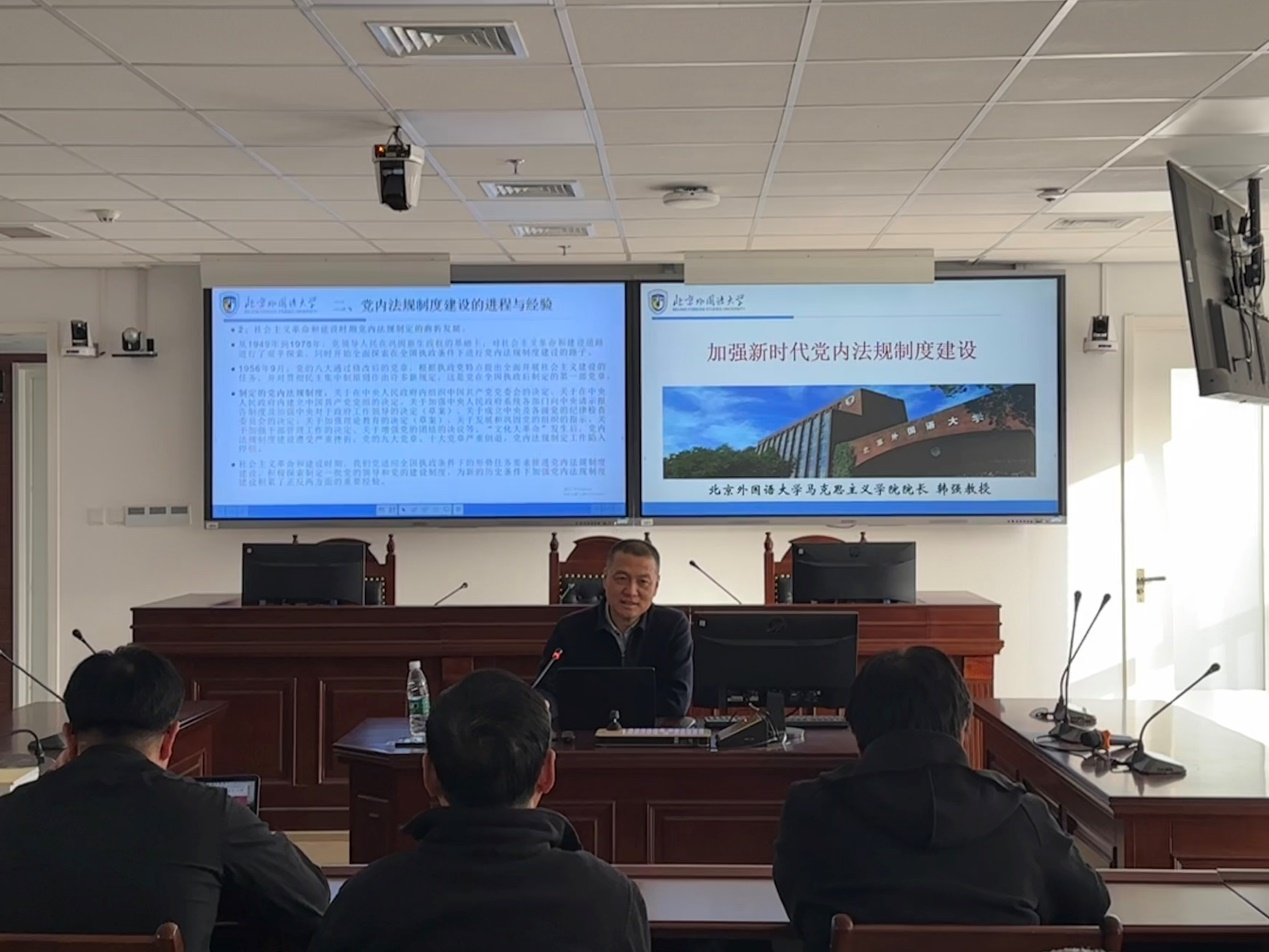 2023年12月6日下午14时,澳门十大信誉网赌大全党总支邀请我校马克思主义学院院长韩强教授以“加强新时代党内法规制度建设”为主题来十大信誉网赌开展专题讲座。澳门十大信誉网赌大全全体教职工参加会议,教工党支部书记董念清主持会议。