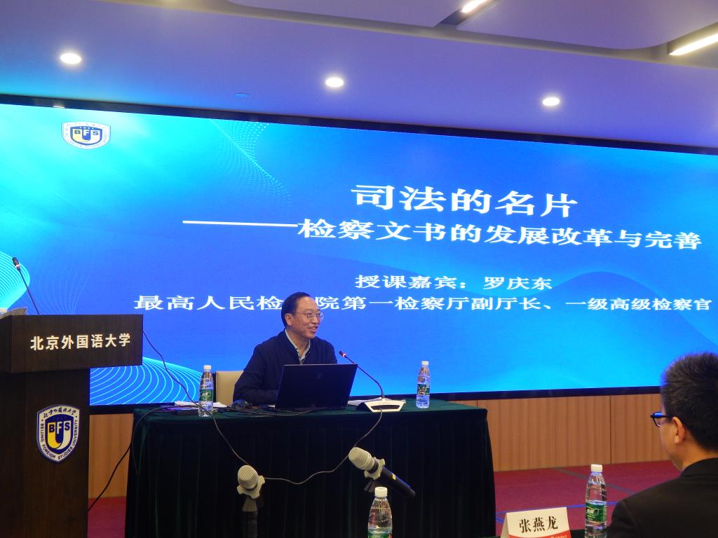 为进一步加强检校合作,拓展在校生司法实践认知,提升法律专业能力,4月3日下午,最高人民检察院“检察实务专家进校园”系列活动第一讲在澳门信誉最好十大平台国际大厦多功能厅成功举办,授课嘉宾为最高人民检察院第一检察厅副厅长、一级高级检察官、中国法学会法律文书研究会副会长罗庆东,授课题目为:司法的名片-检察文书的发展与完善。陪同罗庆东副厅长出席讲座现场的还有最高检政治部师资教材管理处副处长李昉芳。北外澳门十大信誉网赌大全院长米良、党总支副书记郭向华、党总支副书记张燕龙以及院学术委员会主任王文华等澳门十大信誉网赌大全师生出席讲座。讲座由米良教授主持。