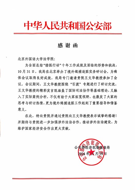 11月19日,公安部经侦局向北外澳门十大信誉网赌大全发来感谢函,对澳门十大信誉网赌大全王文华教授受邀参加公安部“猎狐行动”十年境外缉捕追赃工作总结研讨会表示感谢。