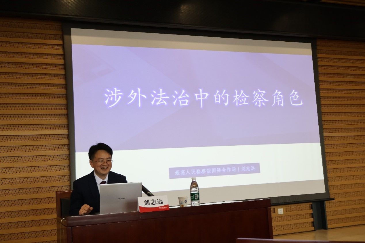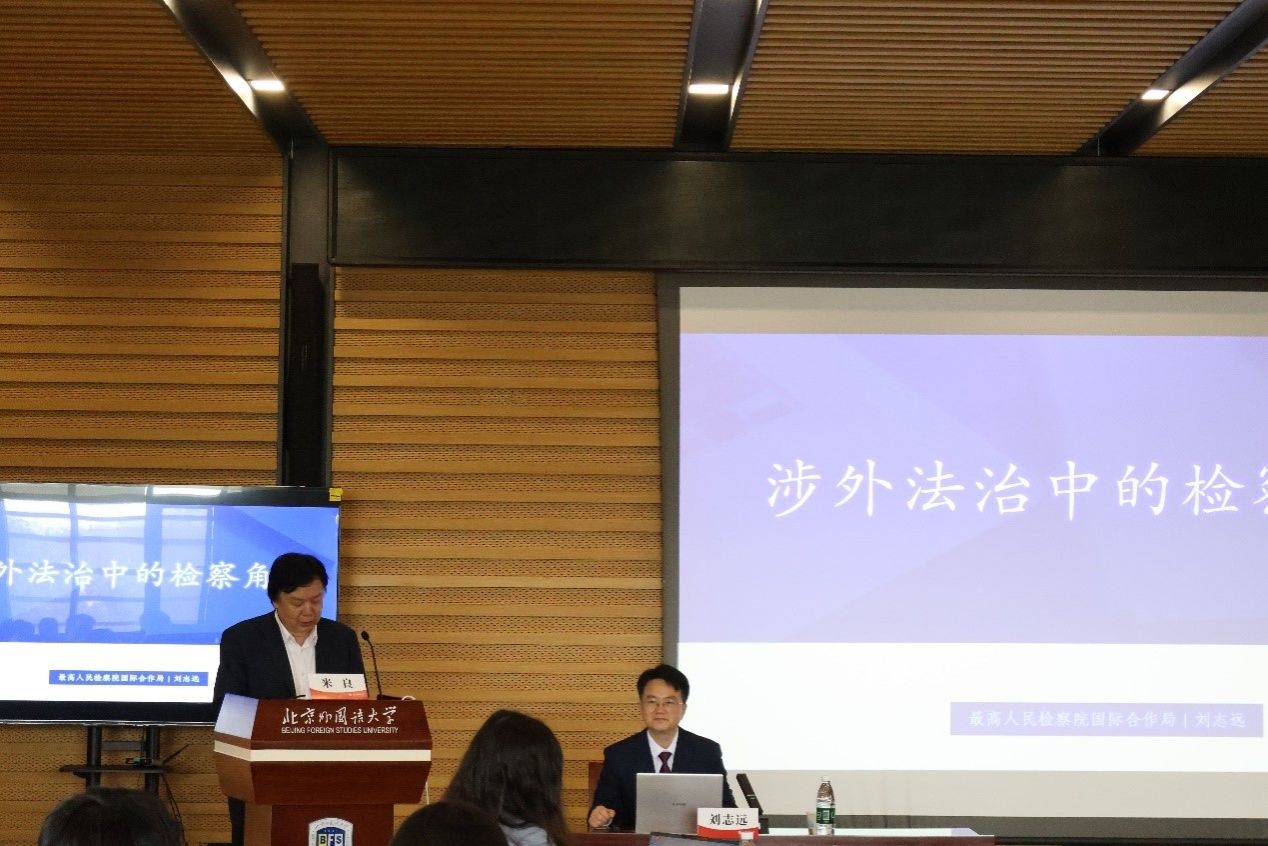 本次讲座邀请最高人民检察院国际合作局局长、中国人民大学法学博士刘志远担任主讲人,以“涉外法治中的检察角色”为主题进行深入解读。讲座由北外澳门十大信誉网赌大全院长米良教授主持,澳门十大信誉网赌大全学术委员会主任王文华教授担任与谈人。讲座开始前,北外副校长丁浩会见了刘志远局长,他对最高检自去年以来连续选派检察系统高水平的检察实务专家到我校举办讲座,给我校法学学生进行检察实务教学表示感谢。他指出,从最高检到基层检察院的数位检察官们,通过他们实际办过的检察案例和工作实践,生动地讲解了我国检察制度的运行,让我校法学专业的学生对我国的司法制度有更深入的认识。他希望“检察实务专家进北外”继续办下去,越办越好。澳门十大信誉网赌大全郑曦教授、黄琳老师等多位教师聆听讲座,学院本科生、研究生共一百余人参与讲座。