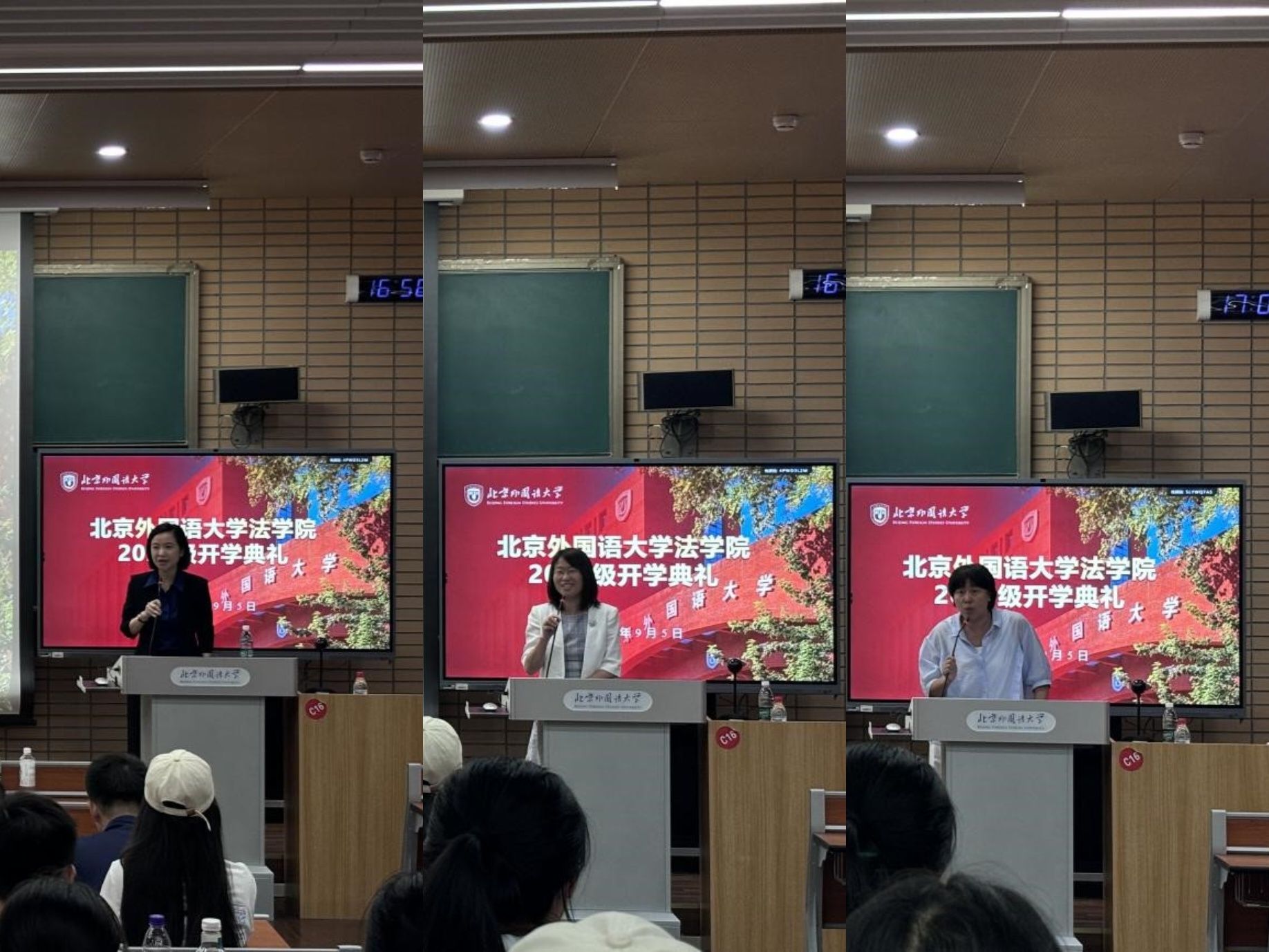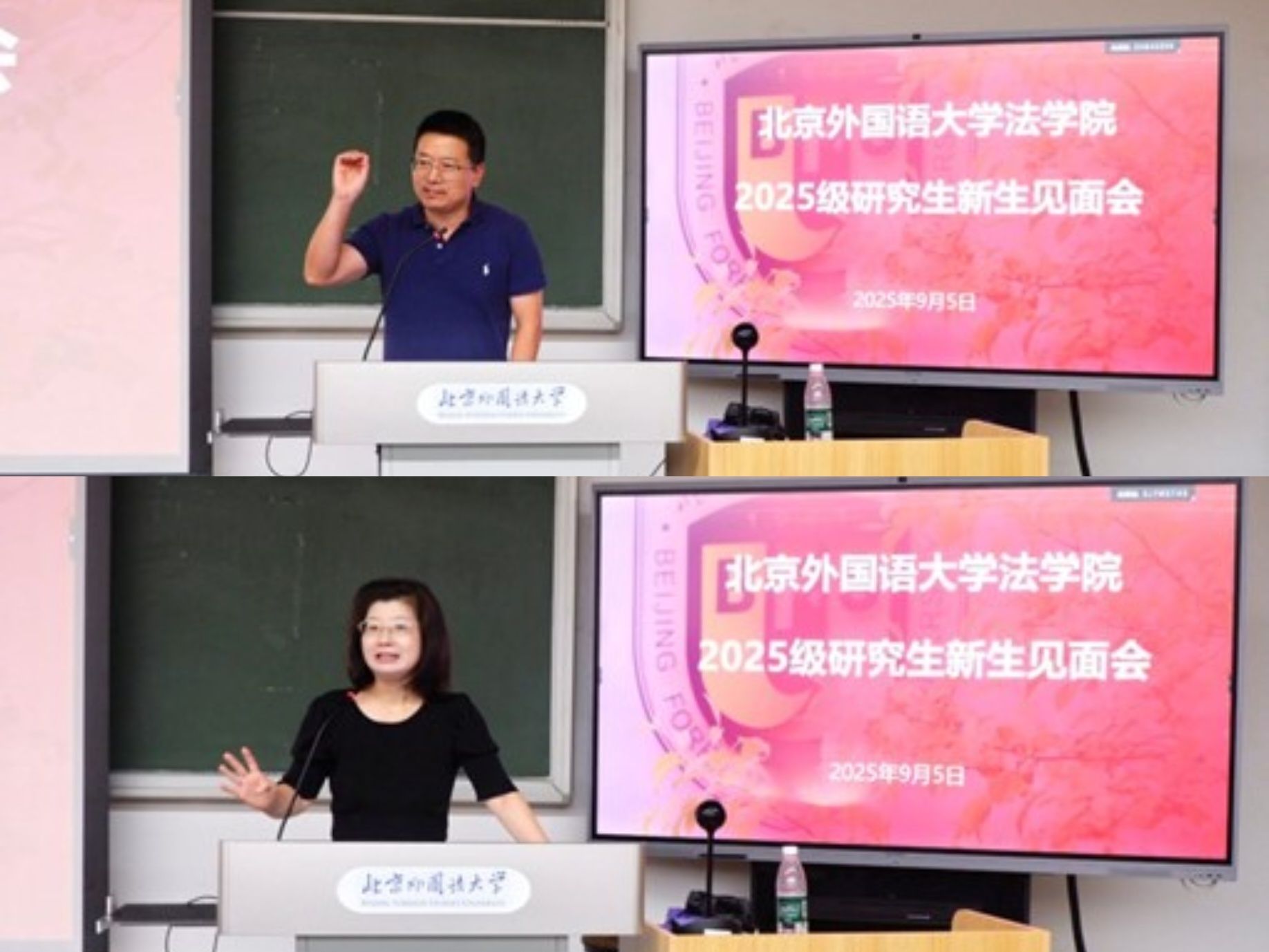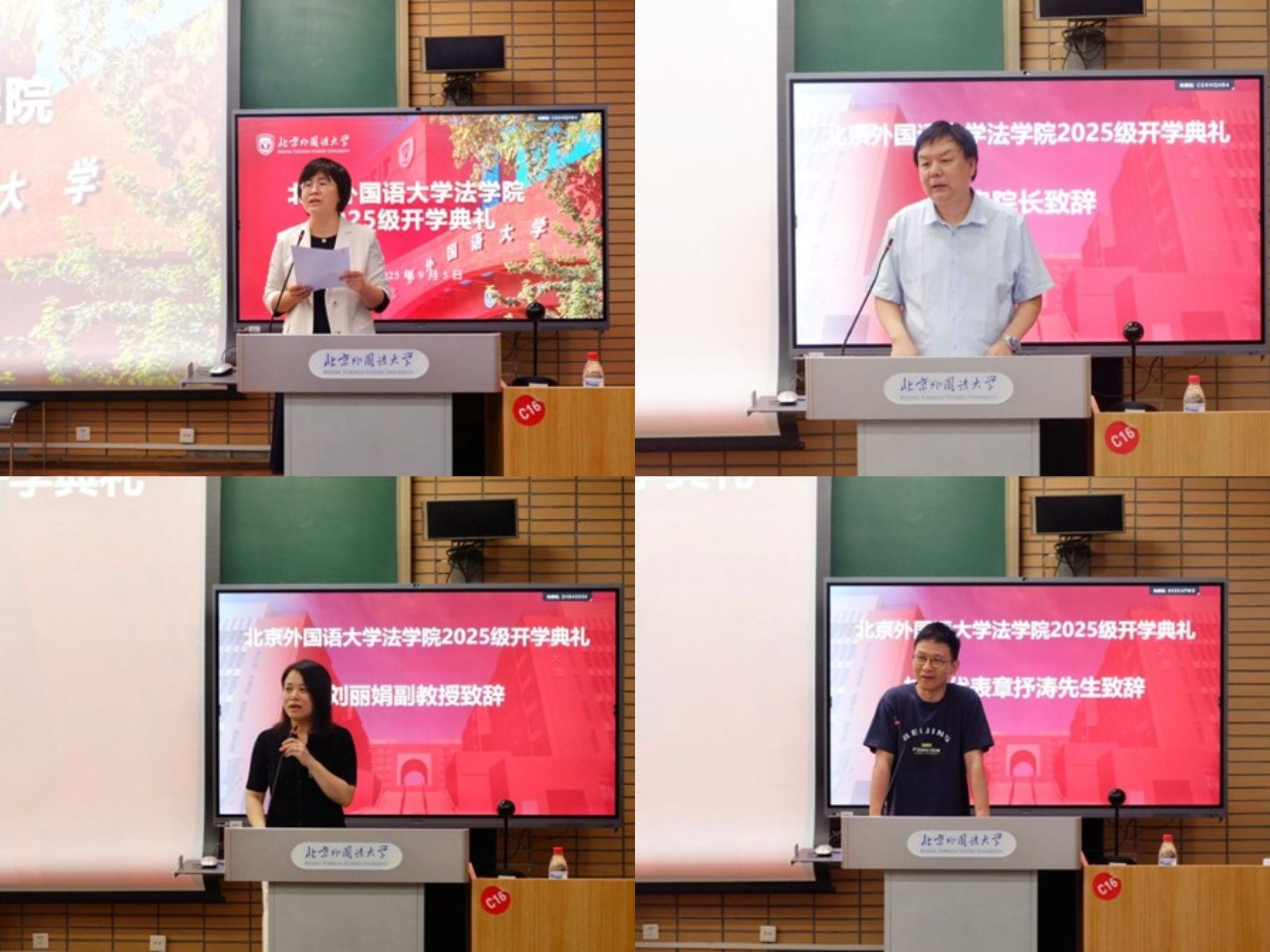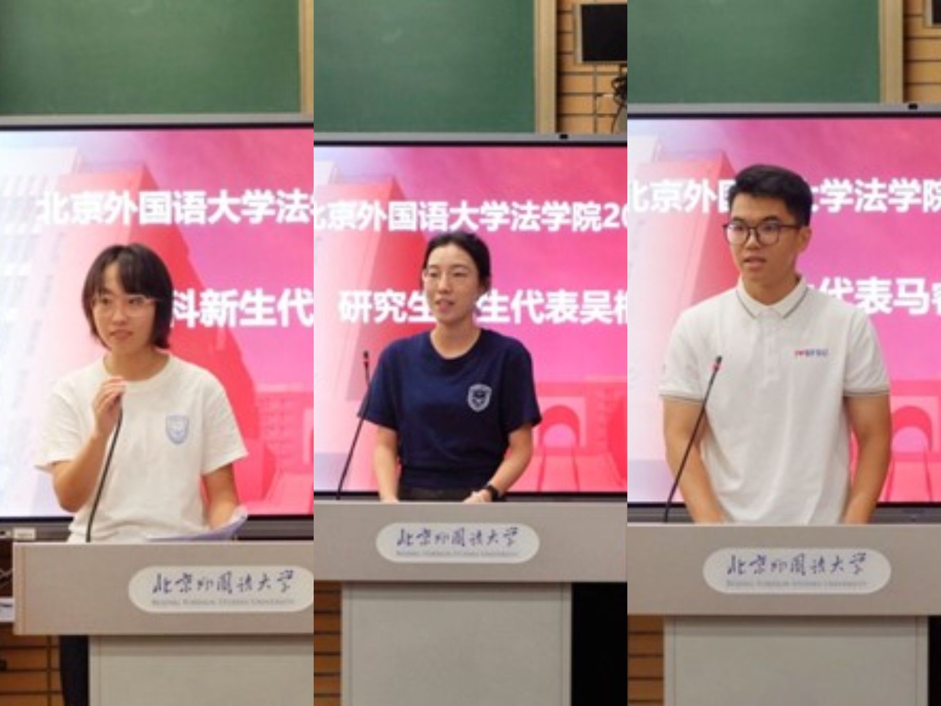 本科新生代表张译文同学、研究生新生代表吴桐芸泽同学分别分享了选择法学专业的初衷、对法治精神的认知与期待,以及对未来的规划,展现了新生对法学领域的热忱与向往。老生代表、2024 级法律硕士马睿宇同学结合自身在北外的学习成长经历,为新同学们提供了务实且温暖的建议。