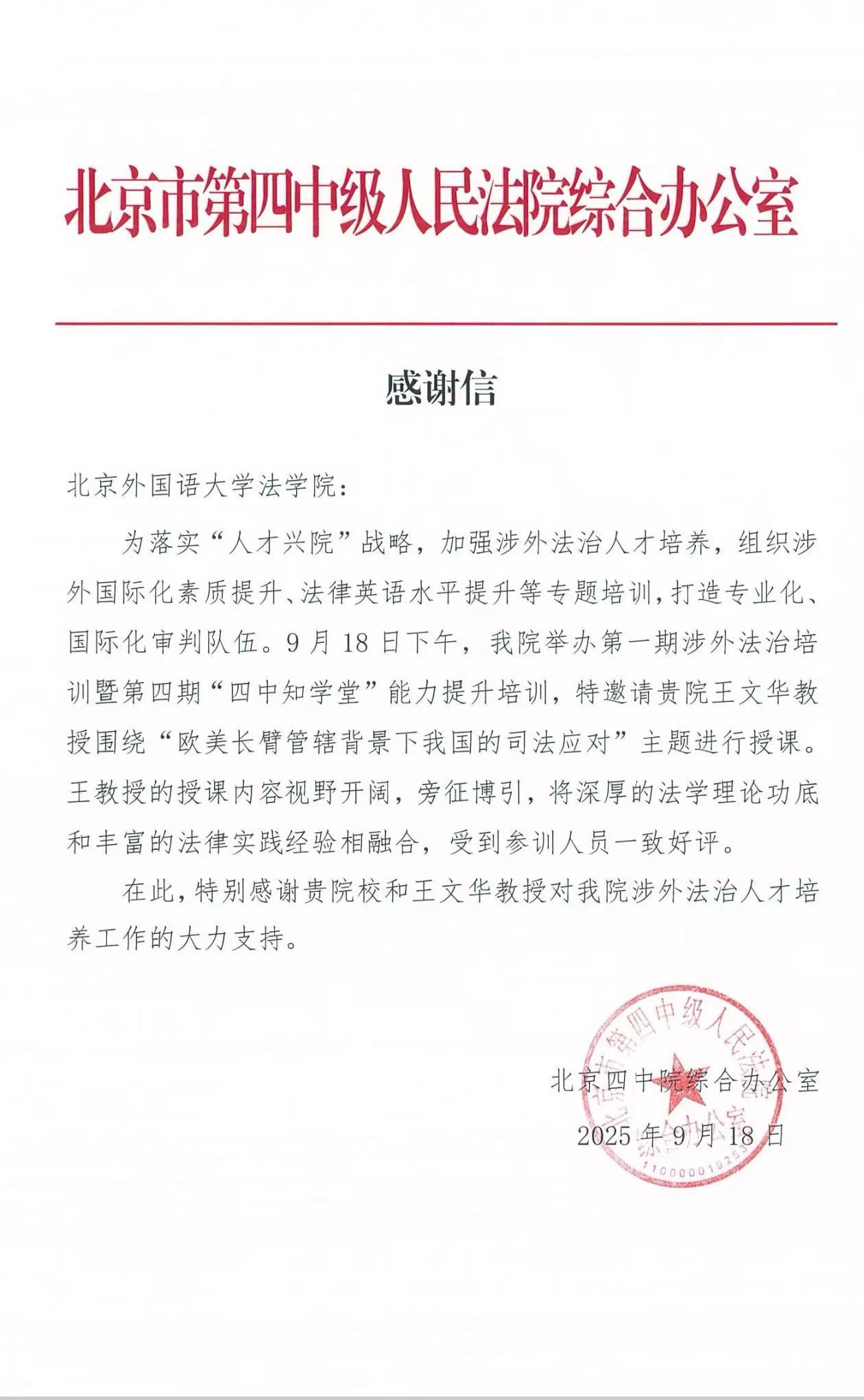 9月18日,北京市第四中级人民法院向我校澳门十大信誉网赌大全发来感谢信,对十大信誉网赌王文华教授所作的讲座“欧美长臂管辖背景下我国的司法应对”表示感谢。