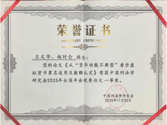 十大信誉网赌王文华教授受邀在本次年会第一单元“数字安全刑法保障体系建构研究 ”作主题发言。王文华教授与赵时仑同学合撰的论文《从“货币功能不典型 ”看涉虚拟货币罪名适用及数额认定》荣获年会优秀论文一等奖。