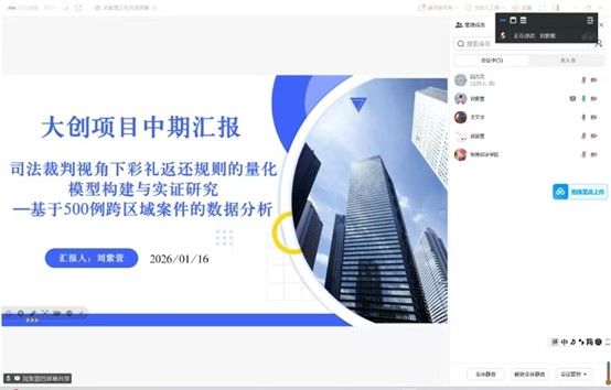 本次会议对2025年“大创计划”中的四组项目进行评估,包括一项国家级项目、一项市级项目与两项校级项目,项目主题为“春风化雨,润物无声——中华优秀传统法律文化的国际传播”“司法裁判视角下彩礼返还规则的量化模型构建与实证研究——基于500例跨区域案件的数据分析”“法学视角下的赴坦桑尼亚中国公民领事保护优化方案研究”与“中匈e路通”。